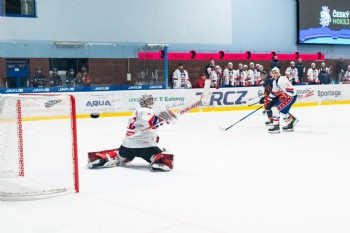Krátce poté přidala Horácká Slavia další zásah, tentokrát v přesilové hře. Ladislav Bittner obdržel kotouč u levé tyče, vytočil se na hranici brankoviště a zavěsil pod horní tyč.